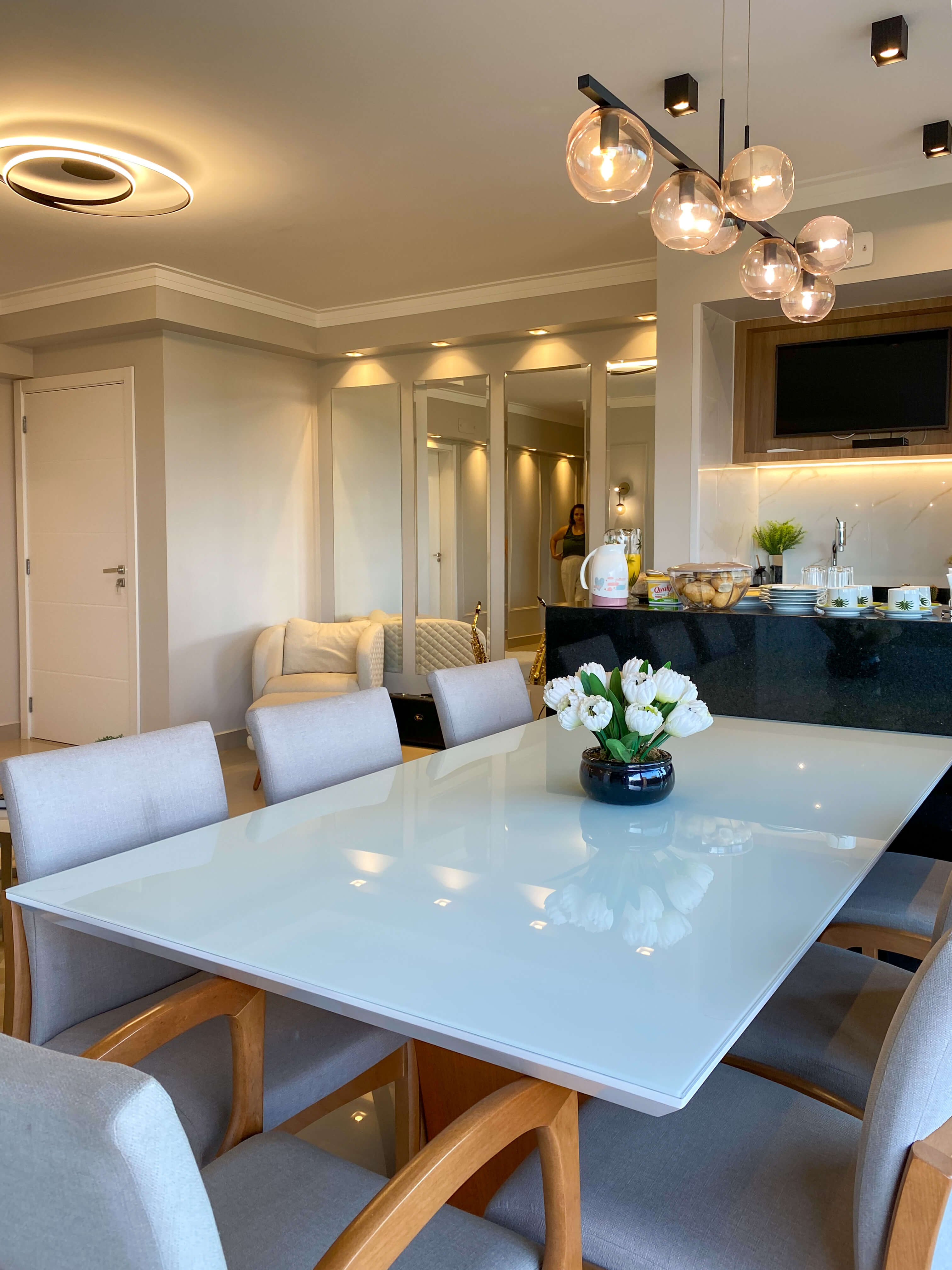 Montamos todos os ambientes deste apartamento, escolhemos desde as cores das paredes, acabamentos de paredes (porcelanatos/revestimento brick), luminotécnico (locação e escolha de luminárias), mobiliários soltos (sofá, mesa, cabeceira, quadros, tapetes), além da elaboração do projeto de móveis planejados.