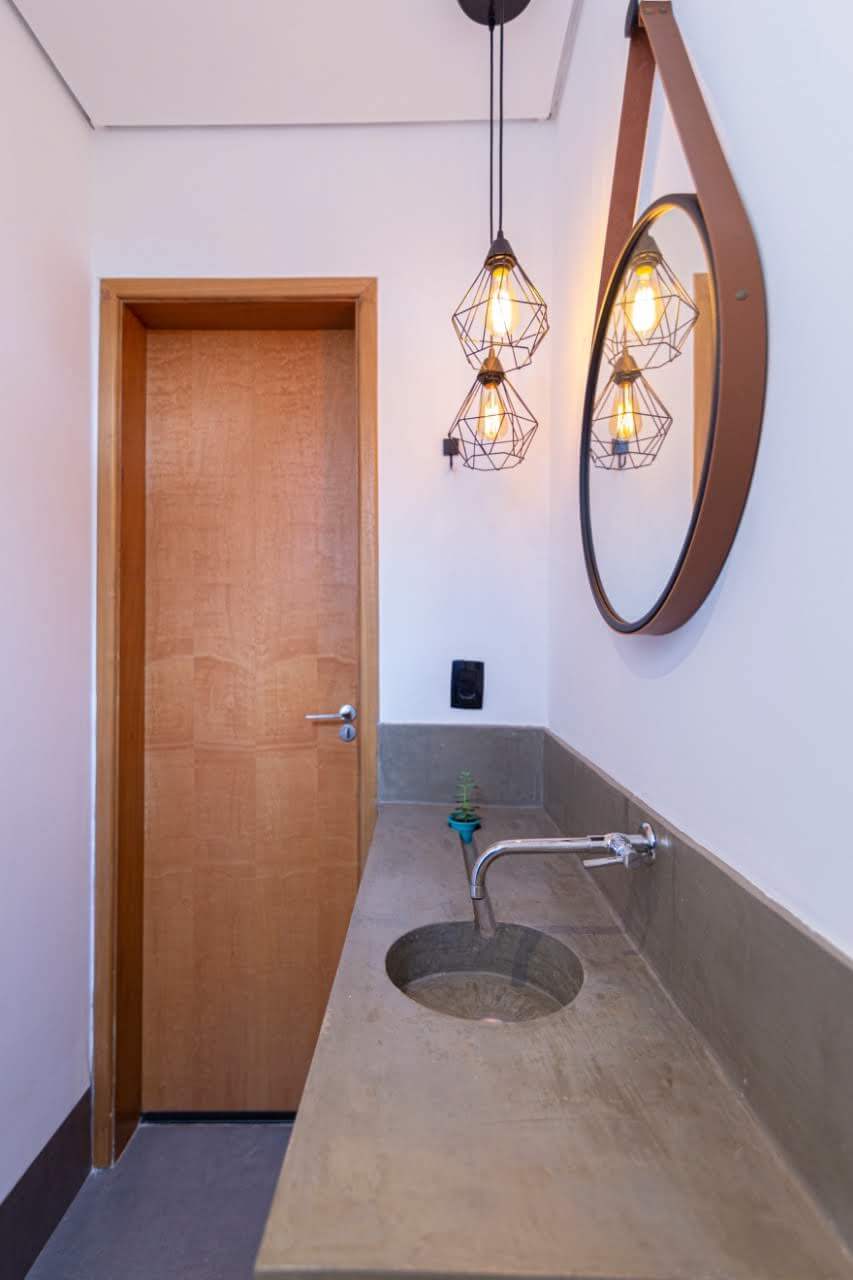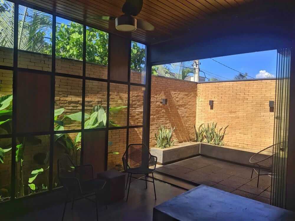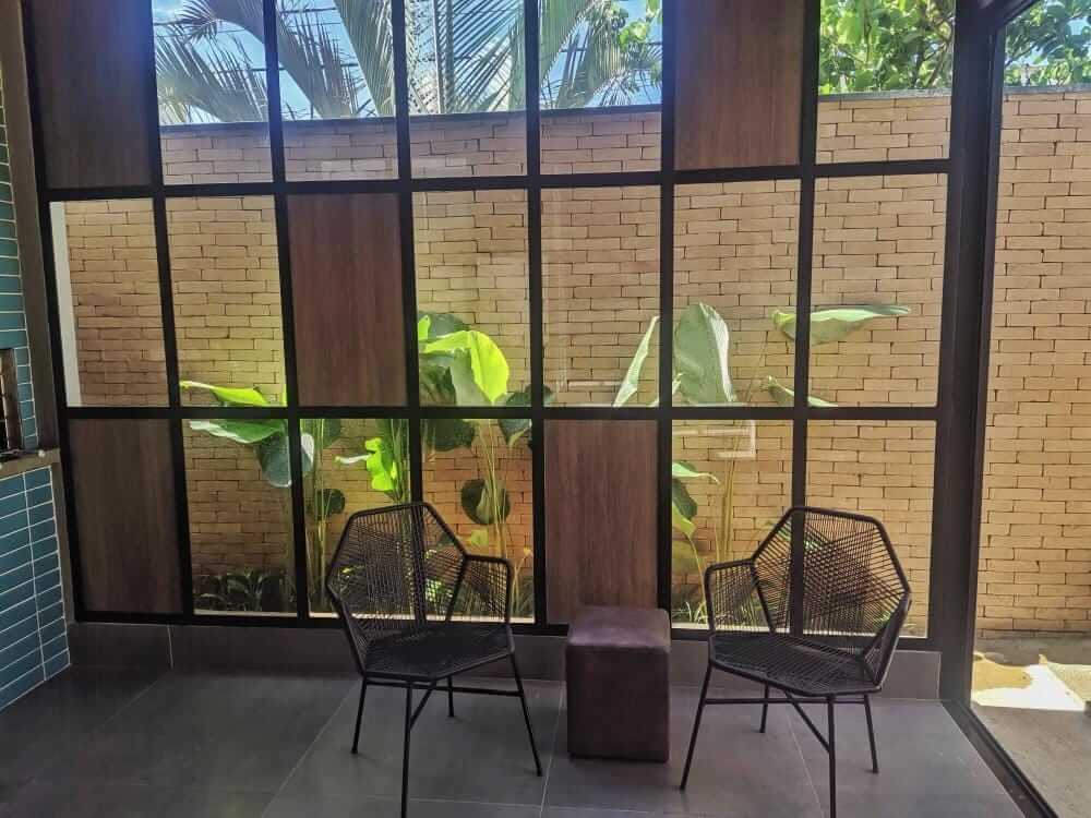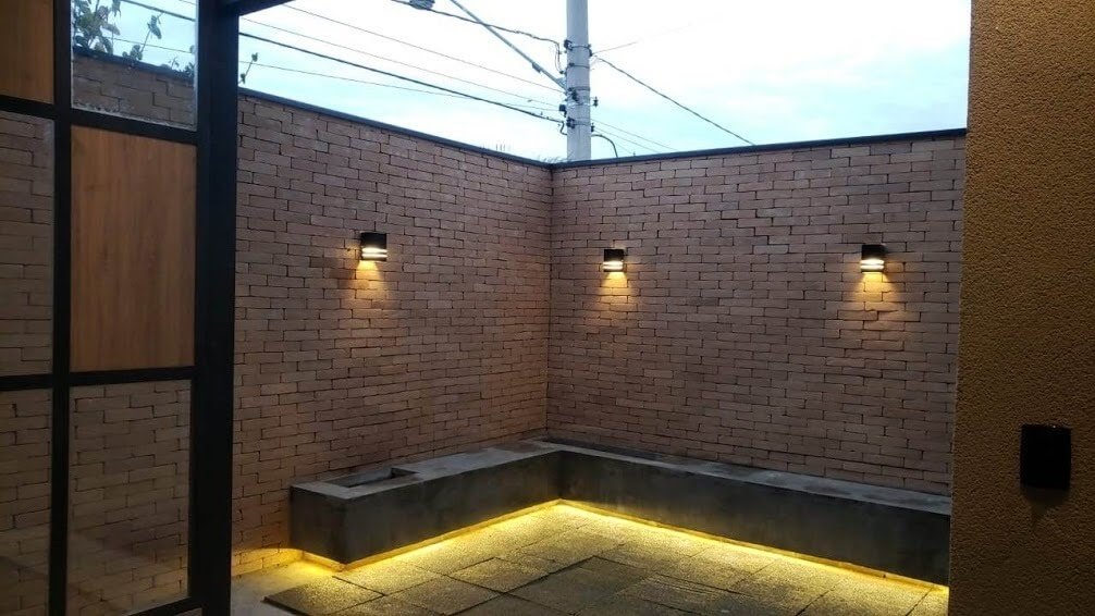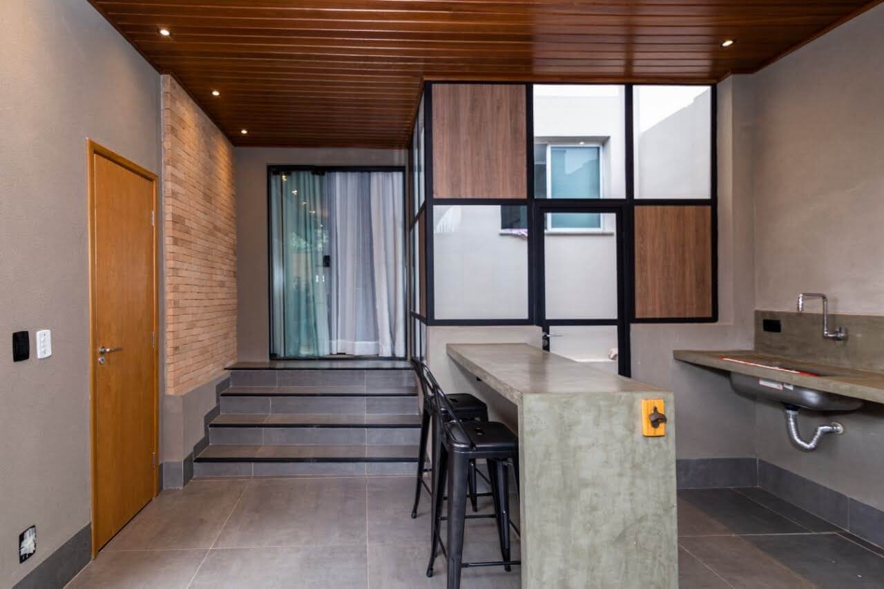 O espaço conta com 24m² de área coberta em estrutura metálica, forro madeirado, com churrasqueira e bancada, além de um banheiro social. E 20m² de área descoberto com banco e paisagismo integrados.