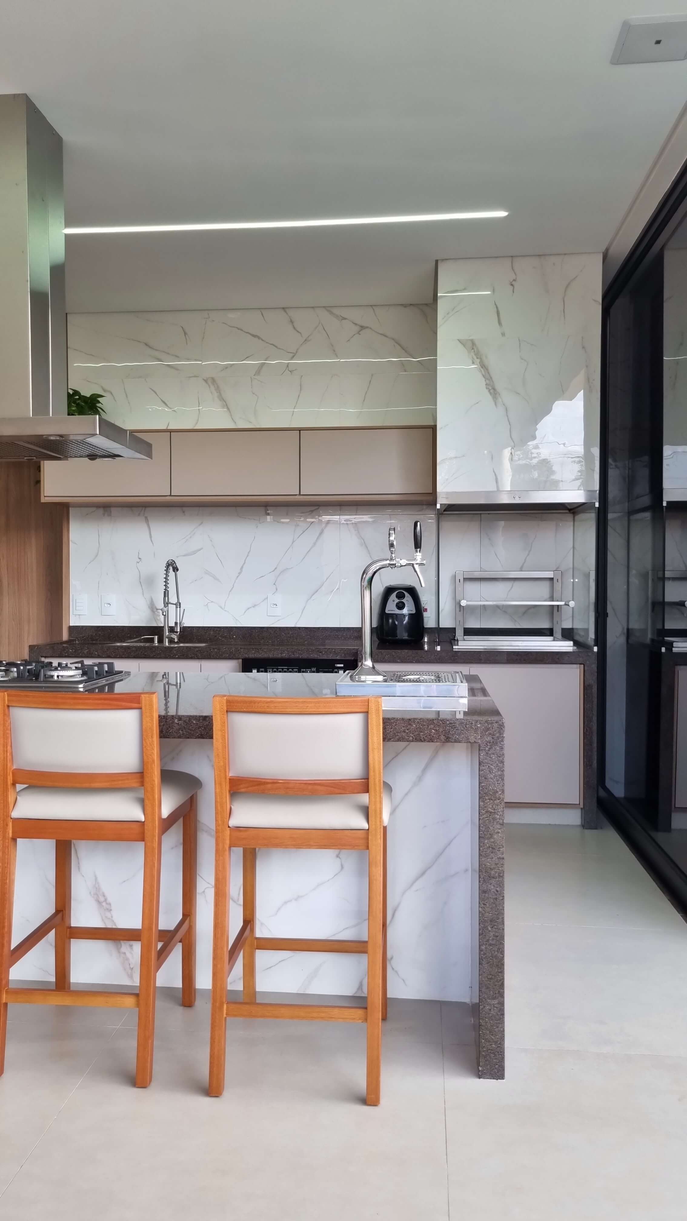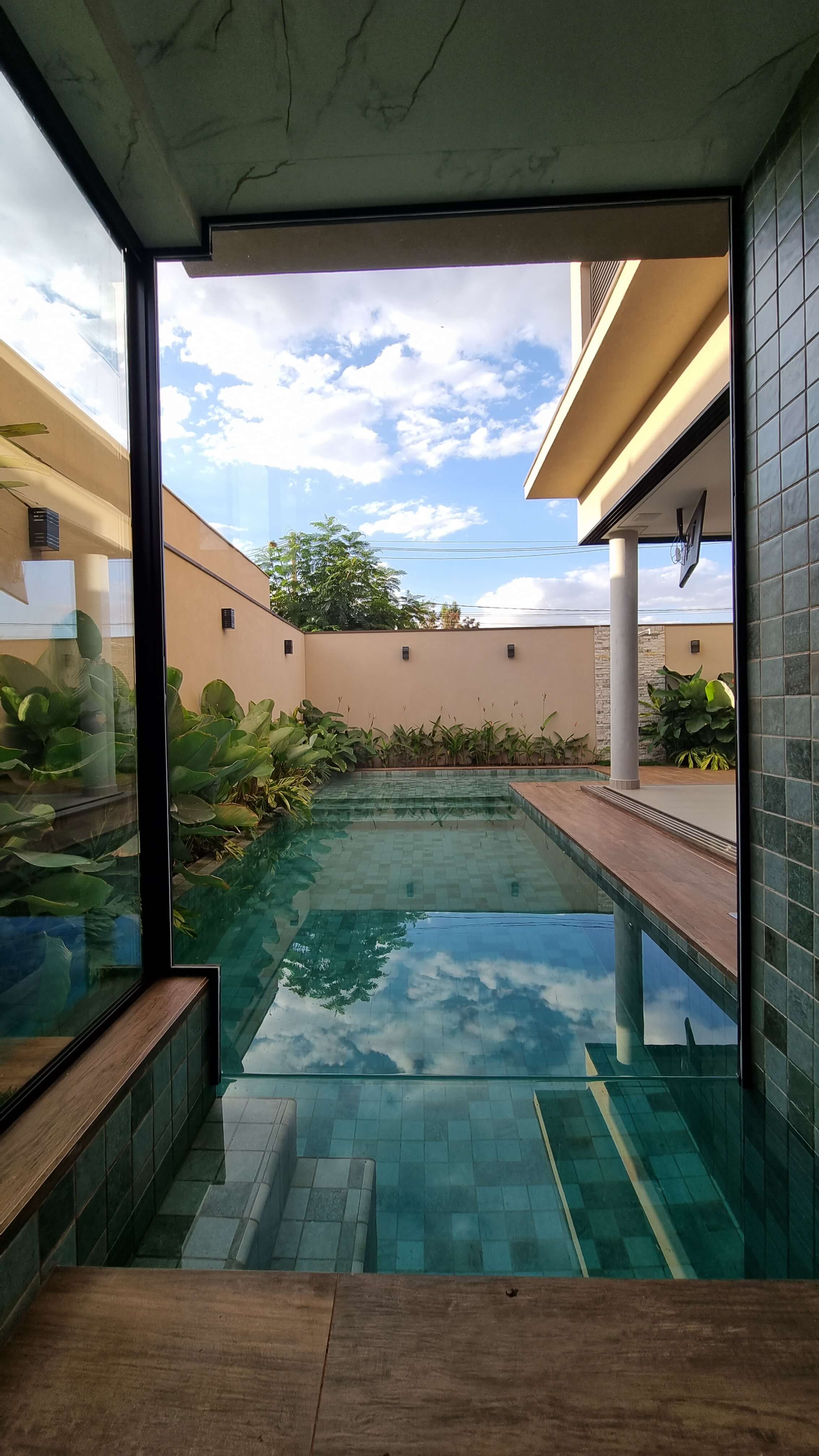 Área social com hall de entrada, sala de Tv, sala de estar integrada com cozinha gourmet aberta para fundos, piscina em L abraçando os fundos da casa.