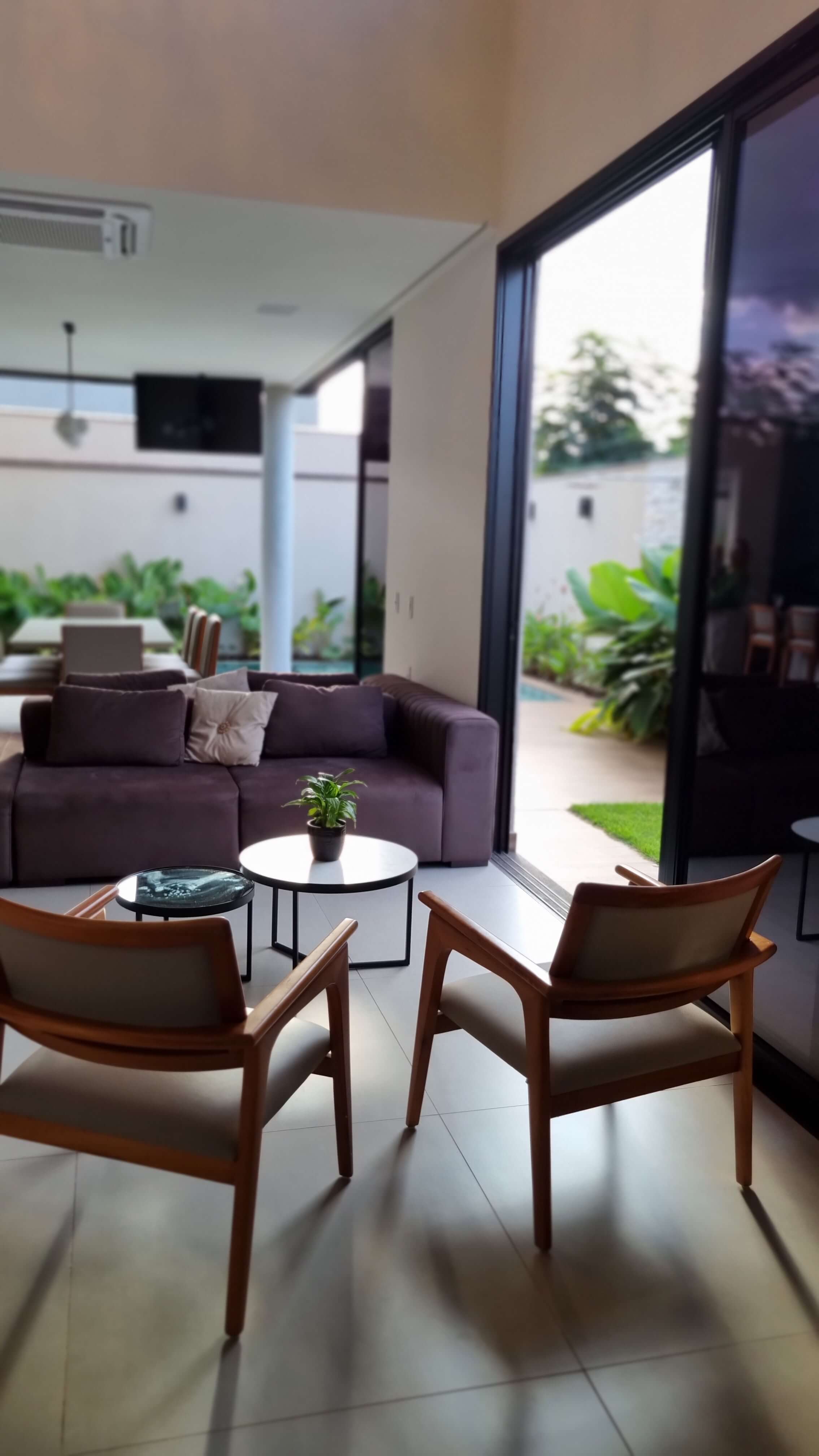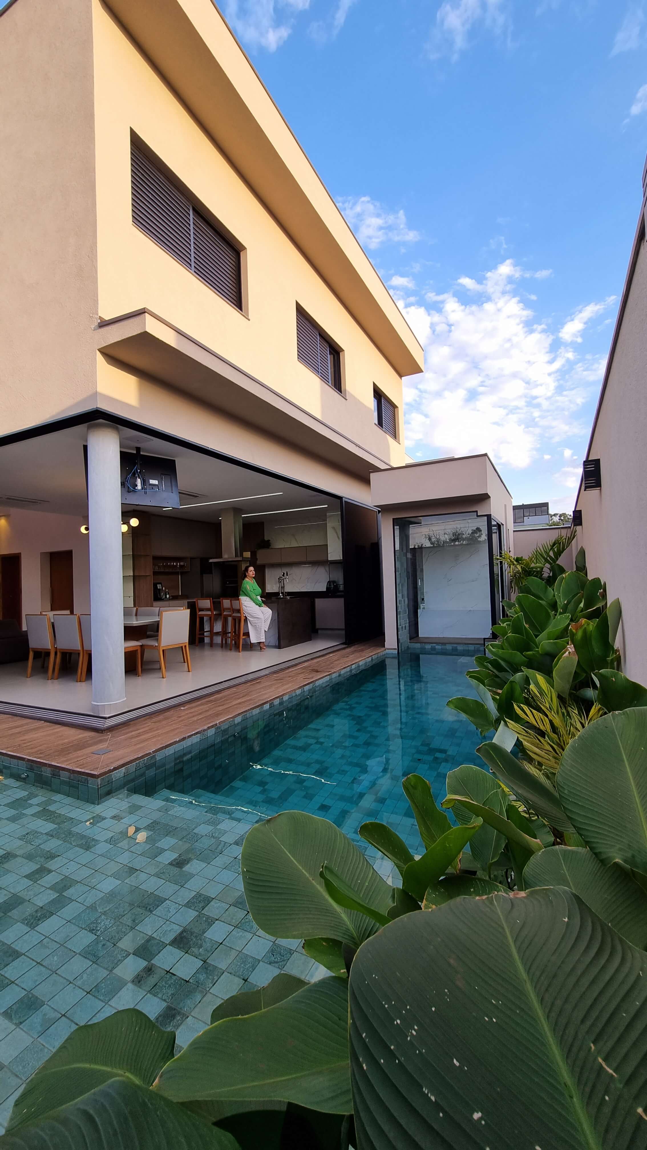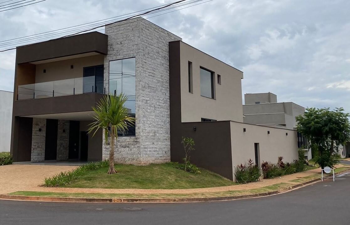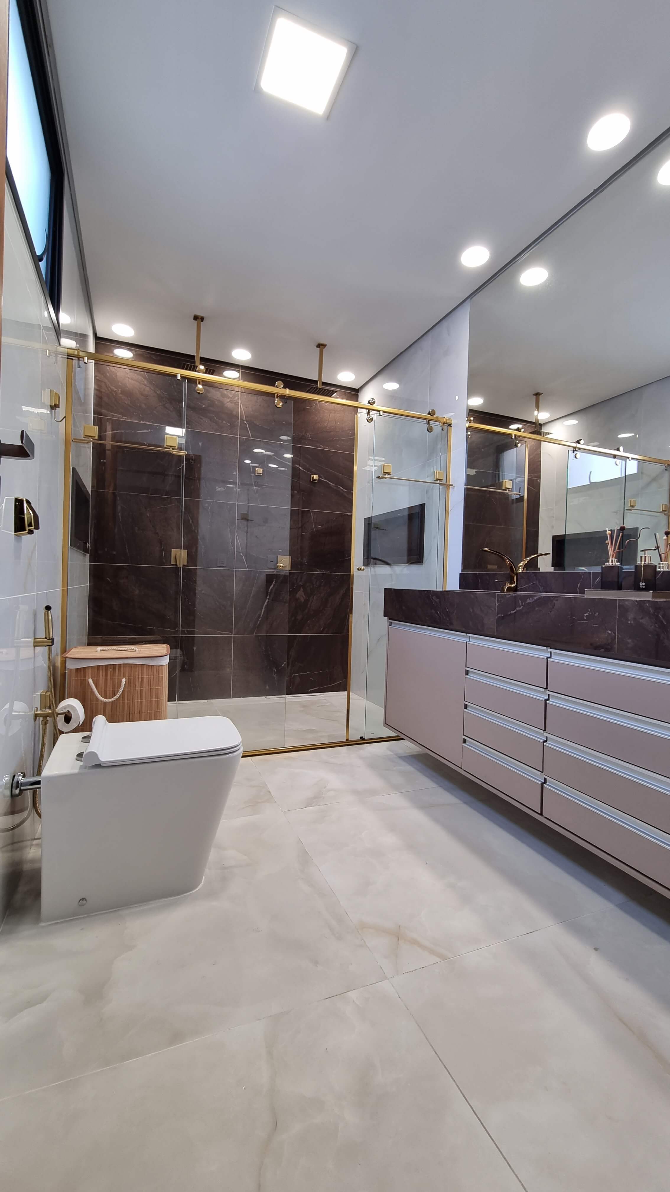 Casa sobrado em condomínio, estilo moderno, com 289,00², área intima com 3 quartos suítes, e mais uma suíte master com sala de banho e closet.